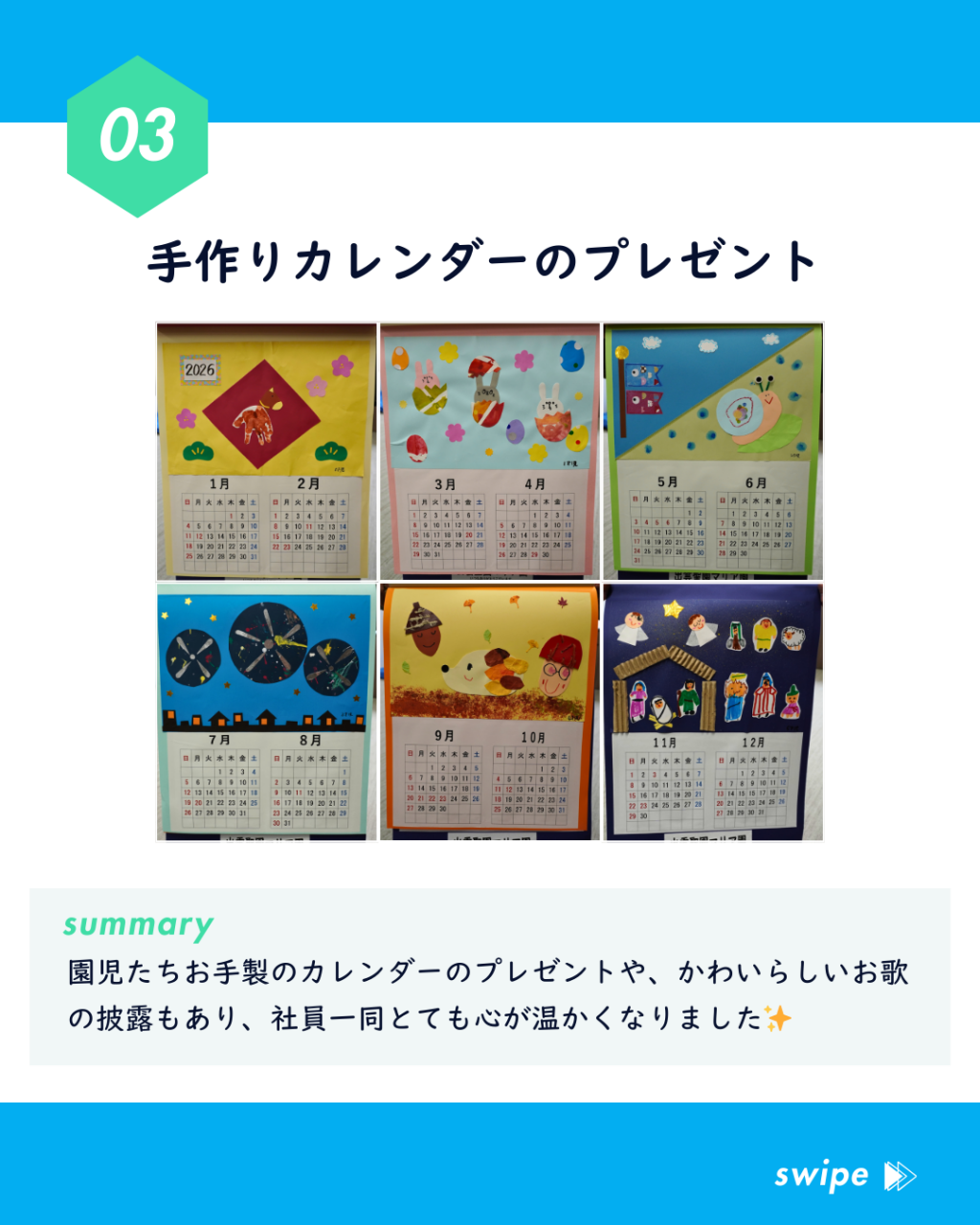 お手製のカレンダーのプレゼントや、かわいらしいお歌の披露もあり、